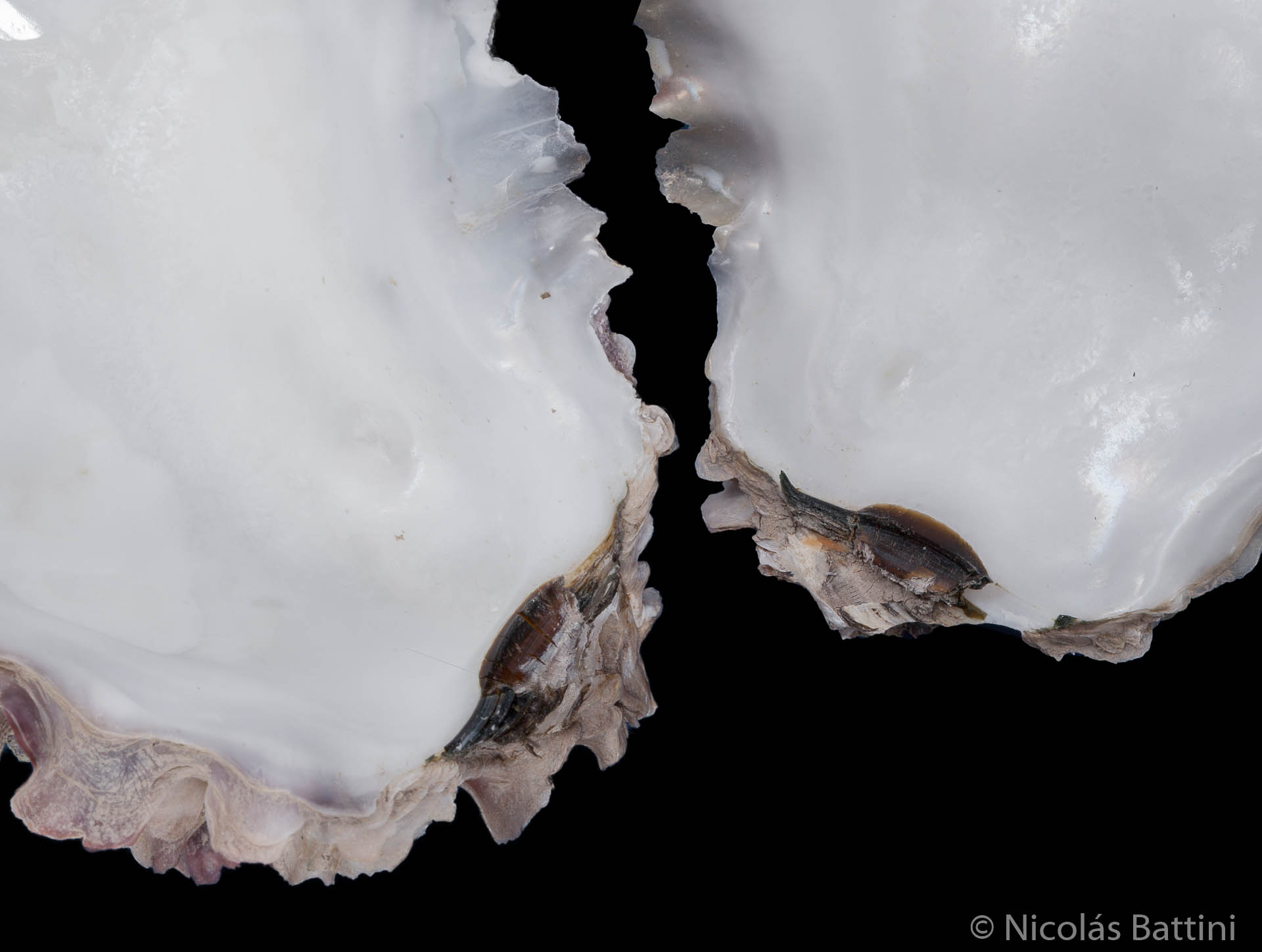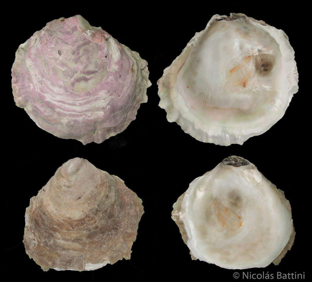 Ostrea puelchana: Nativa. Tamaño menor al de Crassostrea gigas (12 cm de largo). Charnela con dentículos y fosetas. Se distribuye desde Río de Janeiro hasta el Golfo San Matías y forma bancos entre los 9 y 30 m de profundidad.